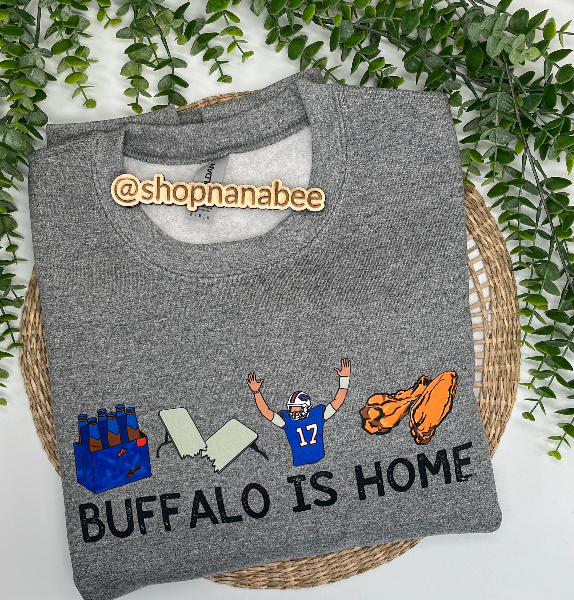 Celebrate your love for Buffalo, NY, with this exclusive Buffalo Is Home crewneck from Nana Bee. Featuring the essentials for any football fan —beer, a broken table, football, and wings—embroidered across the chest, this sweatshirt is the ultimate homage to your hometown pride. Beneath the iconic symbols, the phrase “Buffalo is home” reminds everyone where your heart belongs.