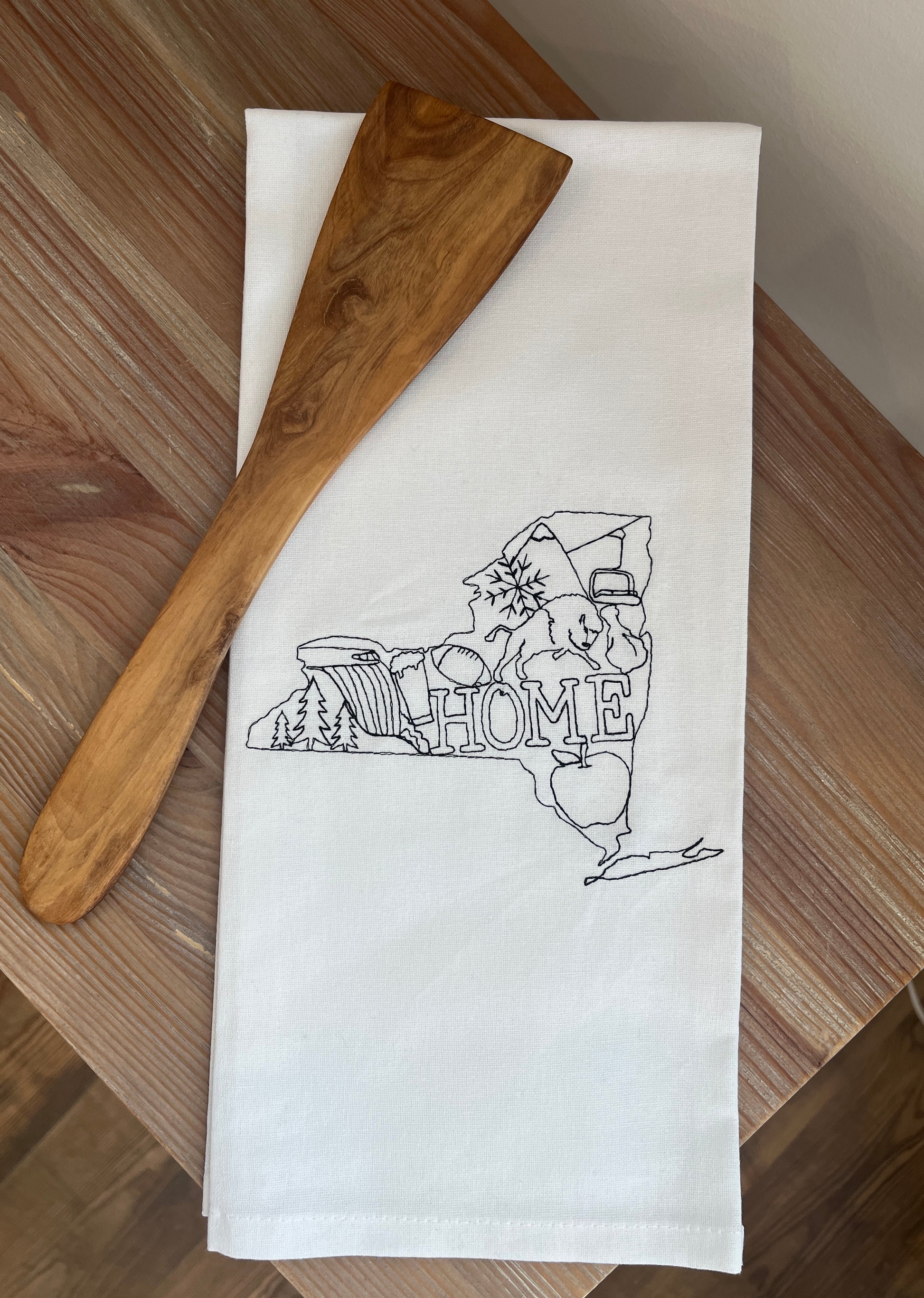 Bring the heart of Buffalo, NY, into your kitchen with this beautifully embroidered kitchen towel. Showcasing the iconic outline of New York State filled with carefully embroidered Buffalo-inspired items—including a buffalo, Niagara Falls, chicken wing, beer, apple, skiing, football, and snowflakes—this towel is as functional as it is meaningful.