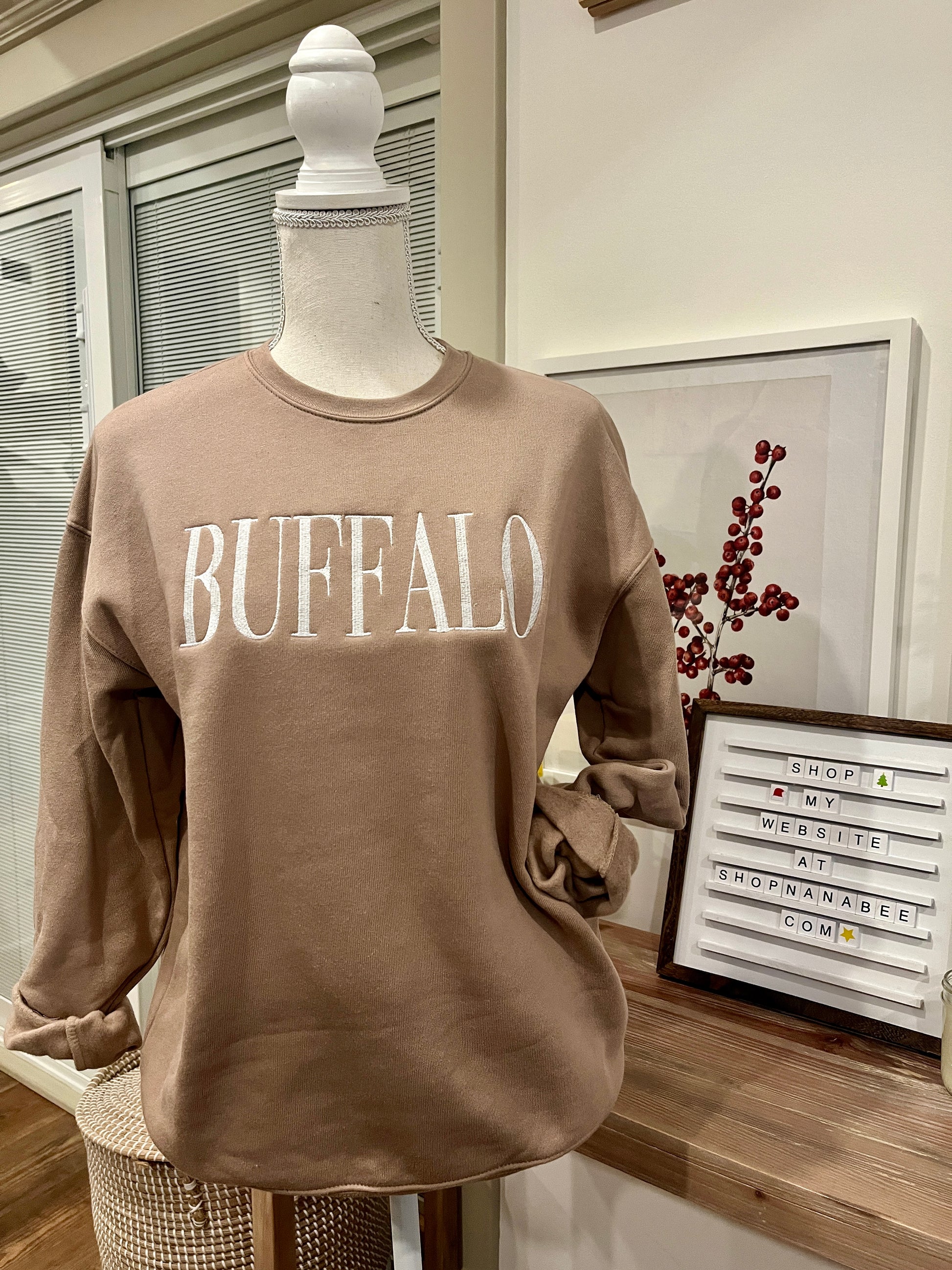 Elevate your casual wardrobe with this timeless tan sweatshirt featuring BUFFALO embroidered in classic white across the chest. With its clean design and premium comfort, this sweatshirt is perfect for representing your love for Buffalo in style.